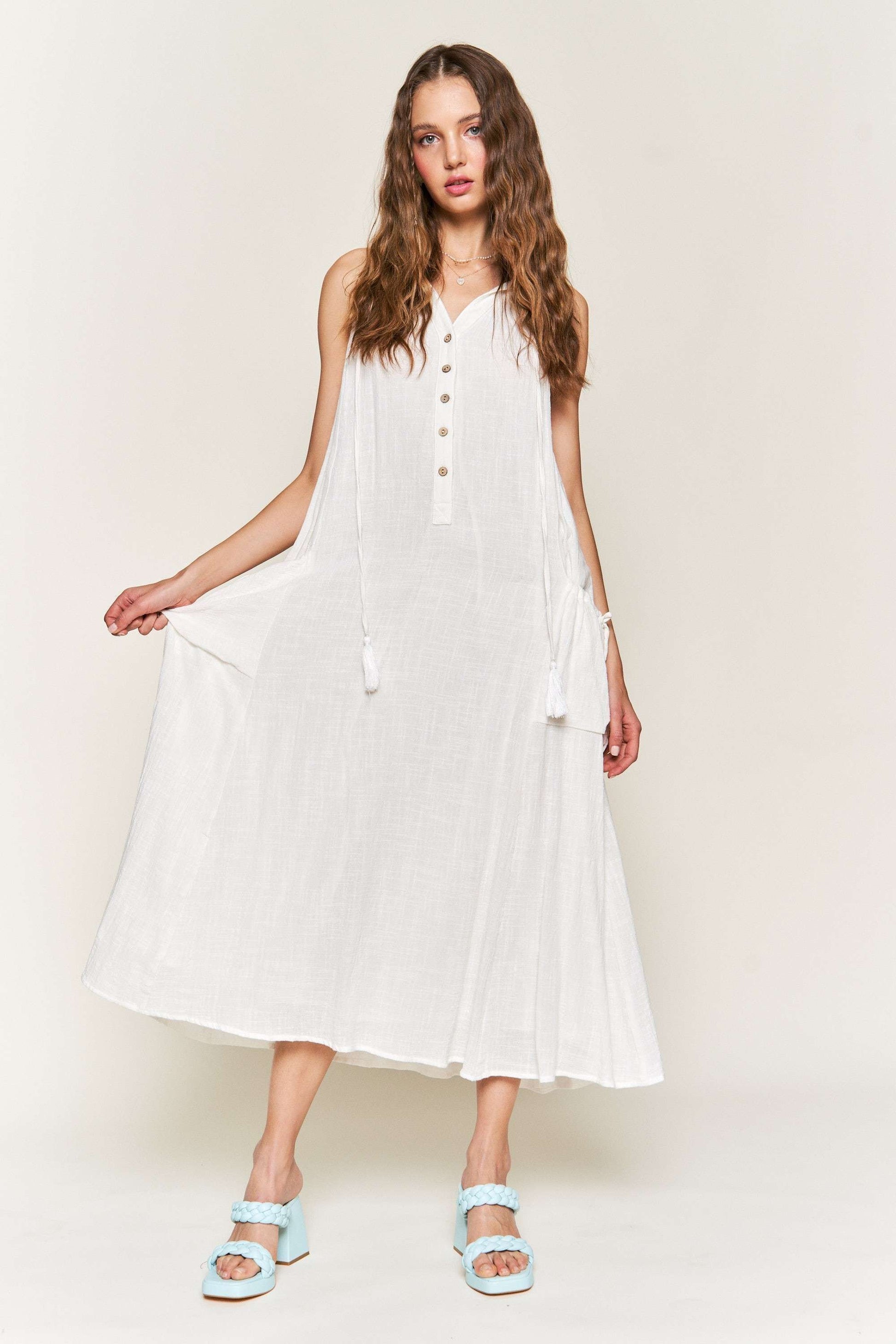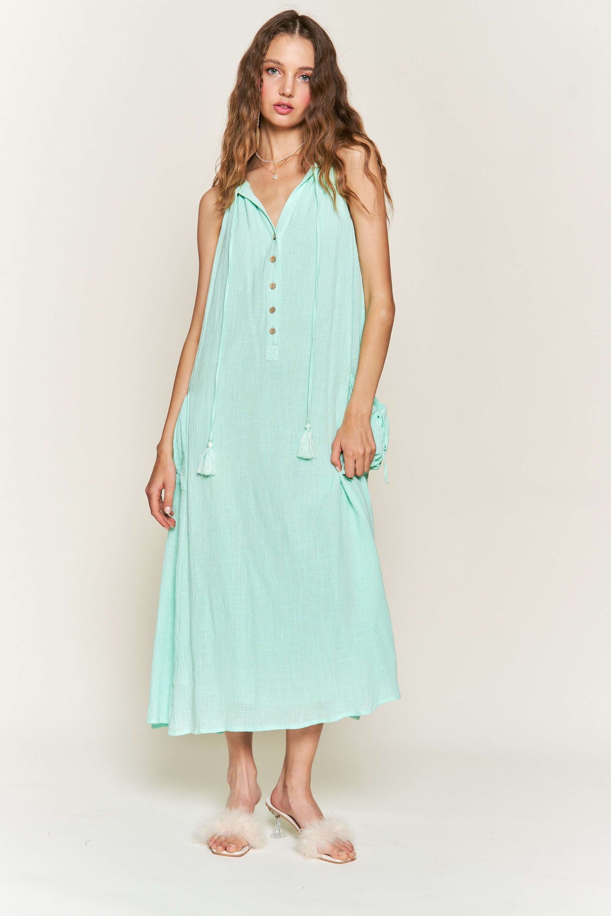 Get ready to slay you summer in the Paige Gauze Maxi Dress. Made from lightweight cotton gauze, this fully lined dress offers both comfort and style. Featuring a flowy maxi silhouette and giant pockets, it also includes a functional drawstring for the perfect fit. This dress is a must-have for any fashion-forward individual.