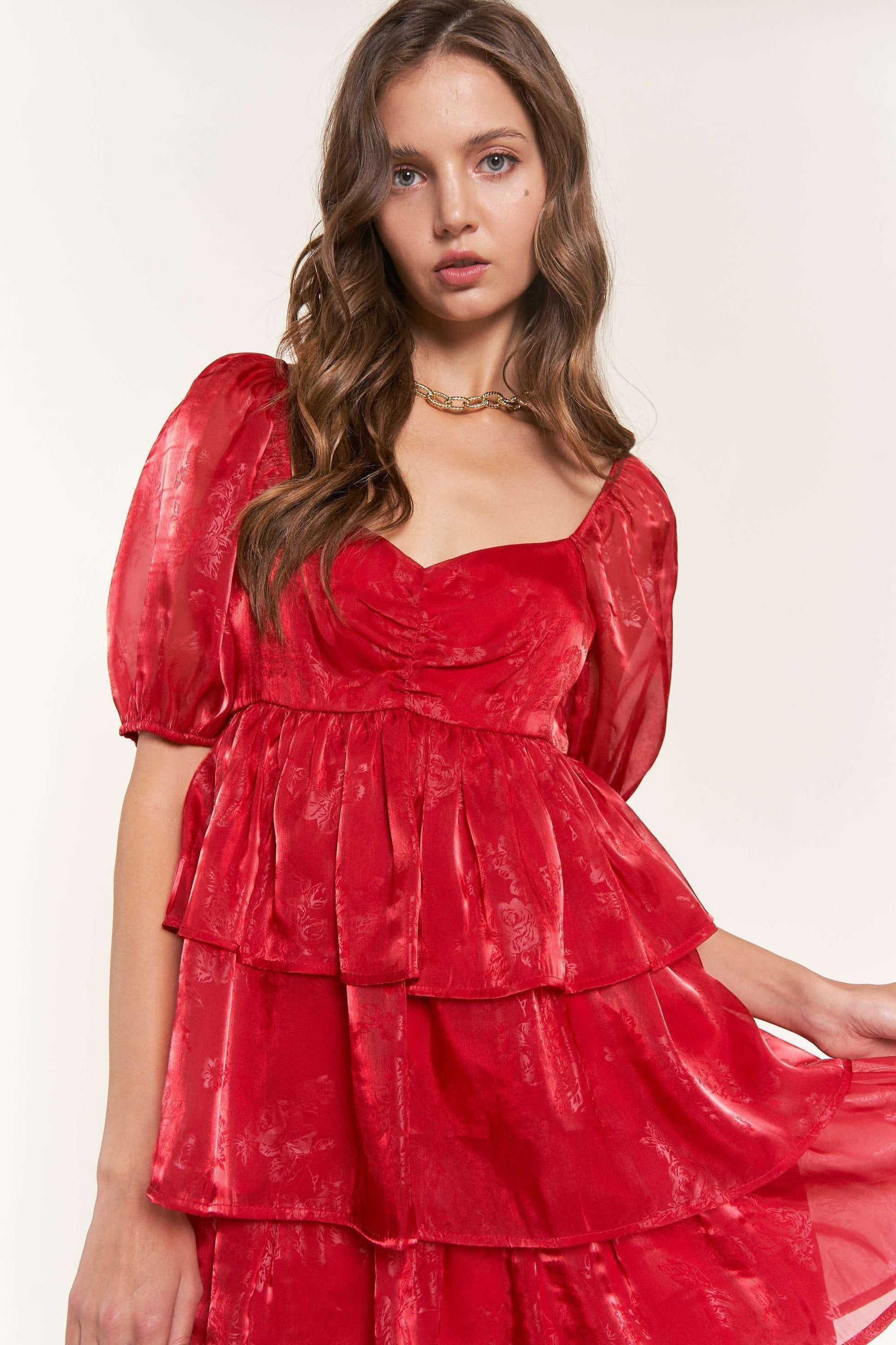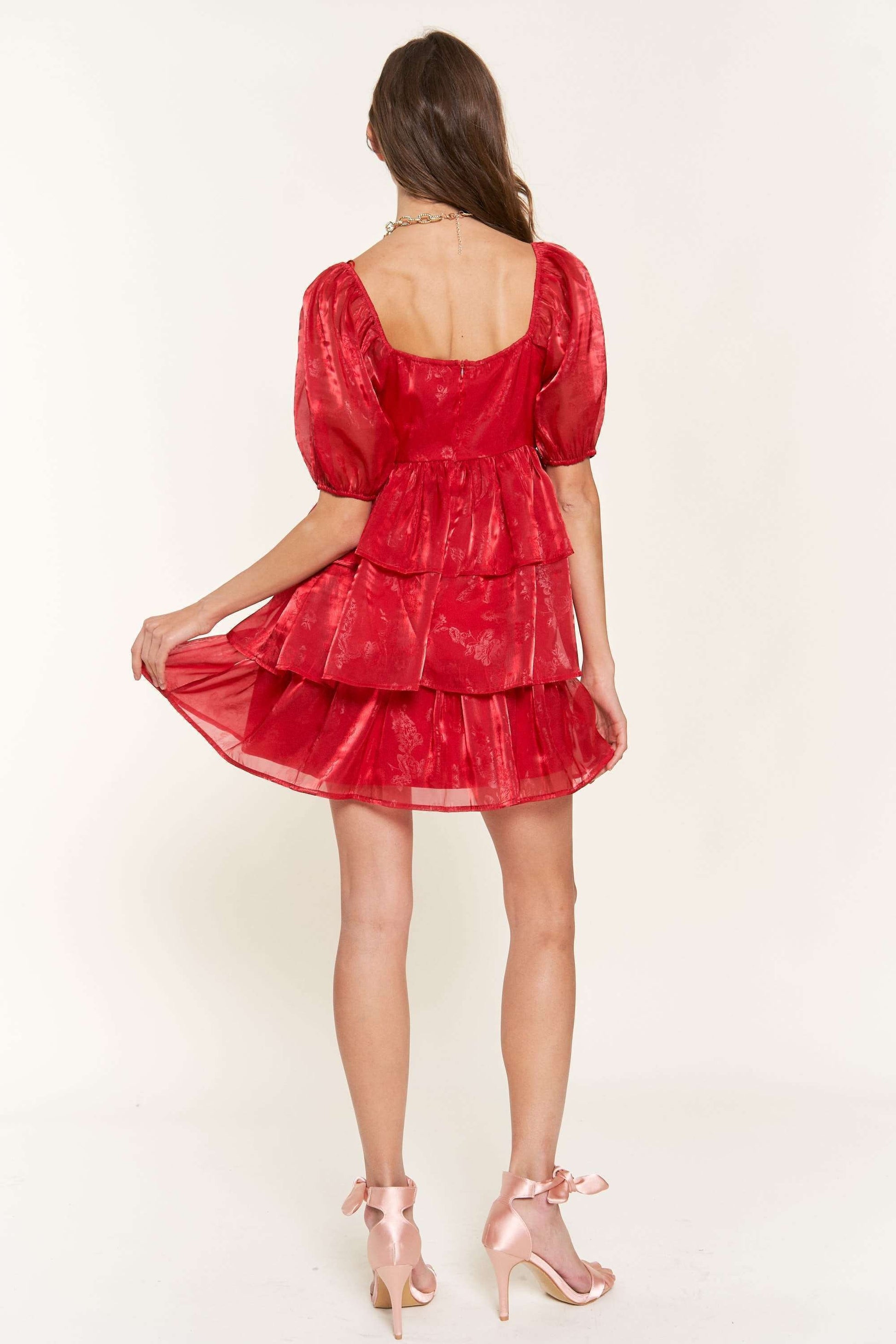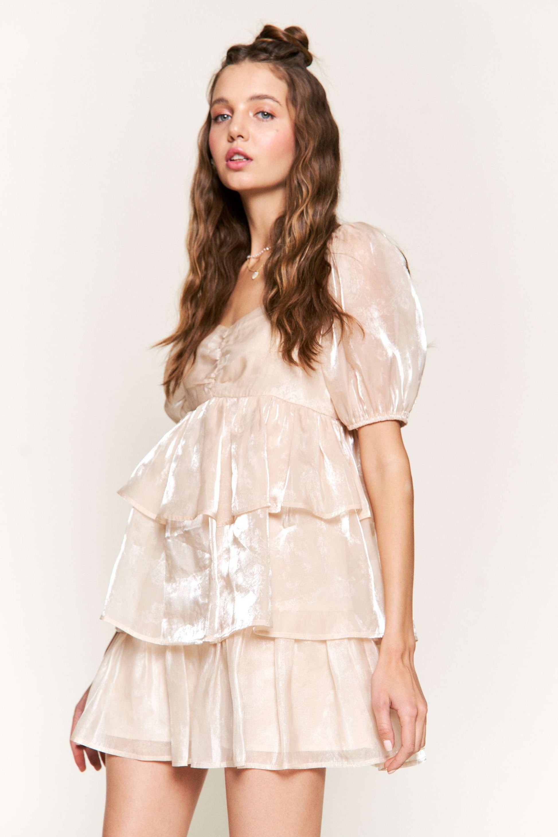 Get ready to shimmer and shine this holiday season in our Shimmer Organza Mini Dress. Made with light and airy organza, this dress features stylish puff sleeves and a tiered design that will make you stand out at any holiday event. Make a statement and feel confident in this must-have mini dress.