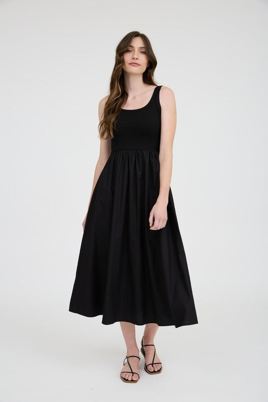 Introducing the Sofie Dress in Black, a simple yet flattering maxi dress that combines mixed media elements. The tank top adds a touch of comfort while the overall design exudes elegance. Perfect for any occasion, this dress will have you standing out in style.